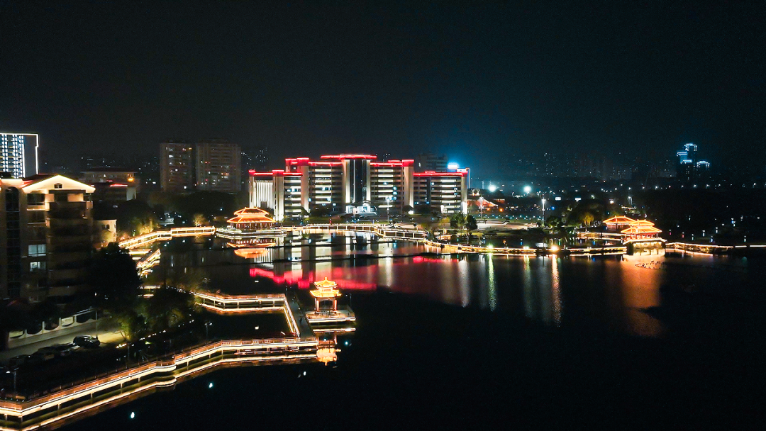 洋澜湖畔楼宇林立,跨湖大桥上光影流动,变幻的色彩、闪烁的灯光如同在城湖间泼洒出一幅气韵生动的水墨画。