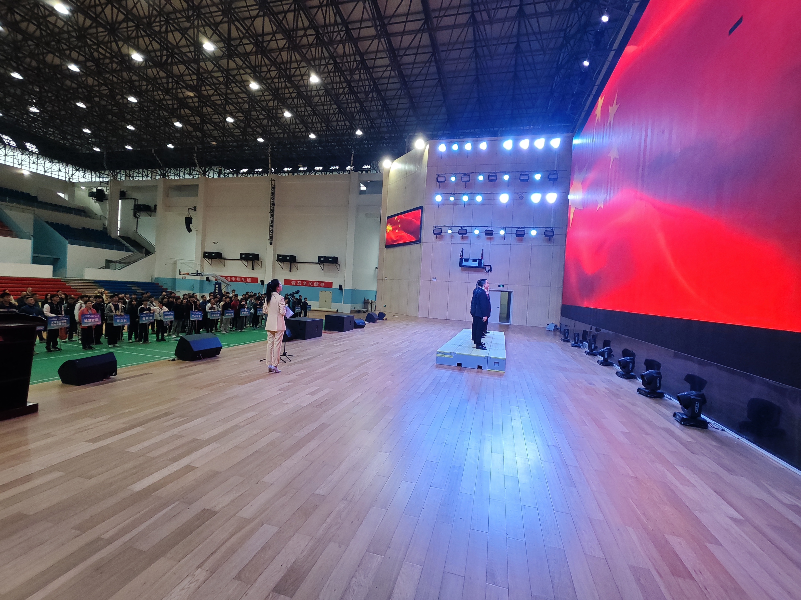 8:38,开幕式在主持人热情洋溢的开场白中正式启动,六项议程有条不紊推进。主持人首先介绍出席的领导嘉宾,向关心支持赛事的各方表示诚挚感谢;随后,全体人员起立奏唱国歌,激昂的旋律在体育馆内久久回荡,凝聚起奋进力量;运动员代表高举右拳庄严宣誓,承诺恪守体育道德、遵守比赛规则,全力以赴赛出风格与水平;裁判员代表紧随其后宣誓,秉持公平、公正、公开原则履行裁判职责;随着一声清脆哨响,首轮12支队伍的6场比赛同步开赛,赛场瞬间被激情点燃。