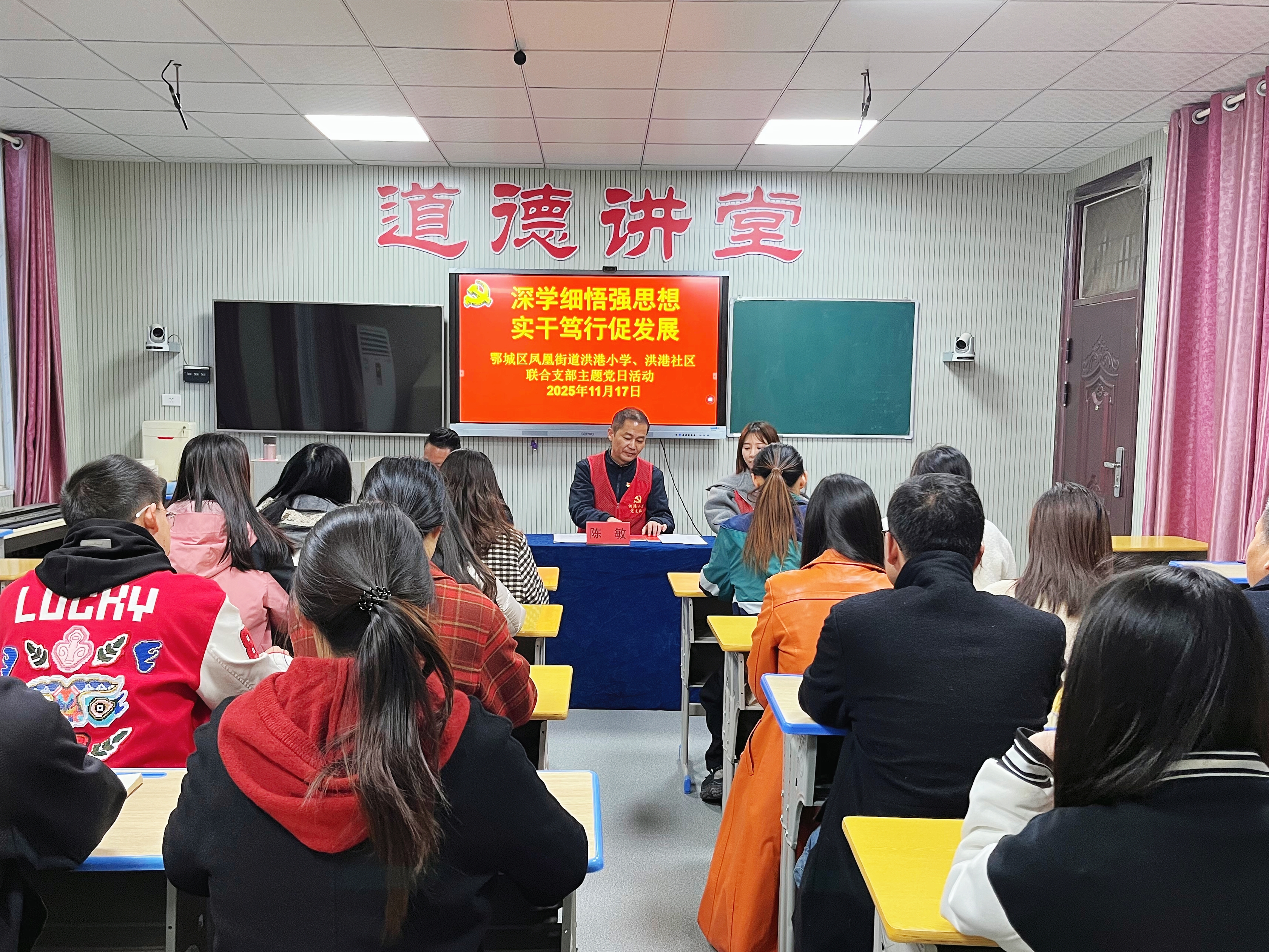 为深入学习贯彻党的二十届四中全会精神,推动全会精神在基层落地生根,11月17日,鄂城区凤凰街道洪港小学党支部联合洪港社区党委,在洪港小学共同举办了一场主题鲜明、内容充实的联合主题党日活动。本次活动聚焦“家校社协同育人”核心议题,通过专题宣讲、互动交流等形式,汇聚党员教师、社区党员及党员家长代表等40余人的智慧与力量,共同探讨如何以党建为引领,绘就育人“同心圆”。