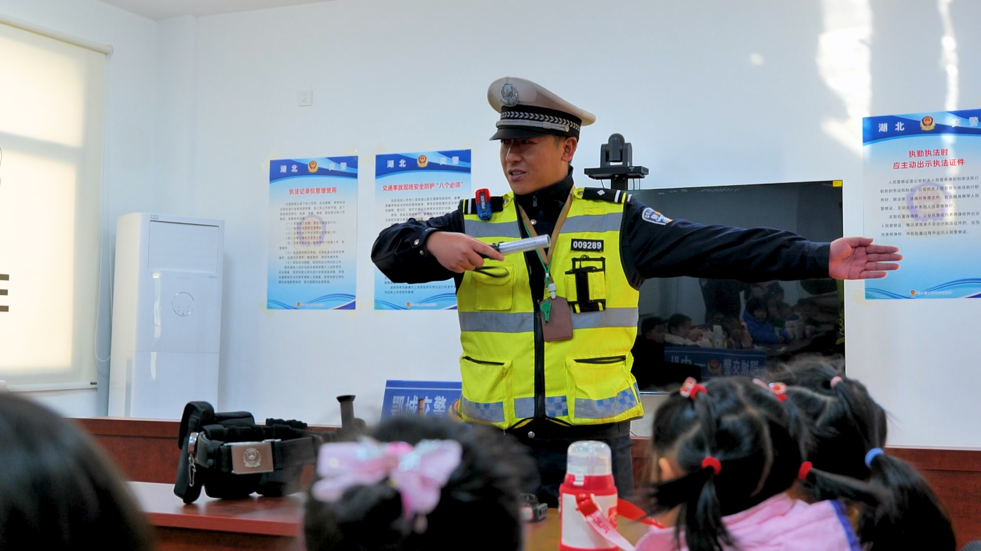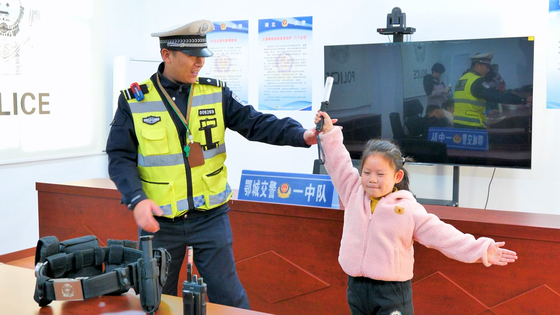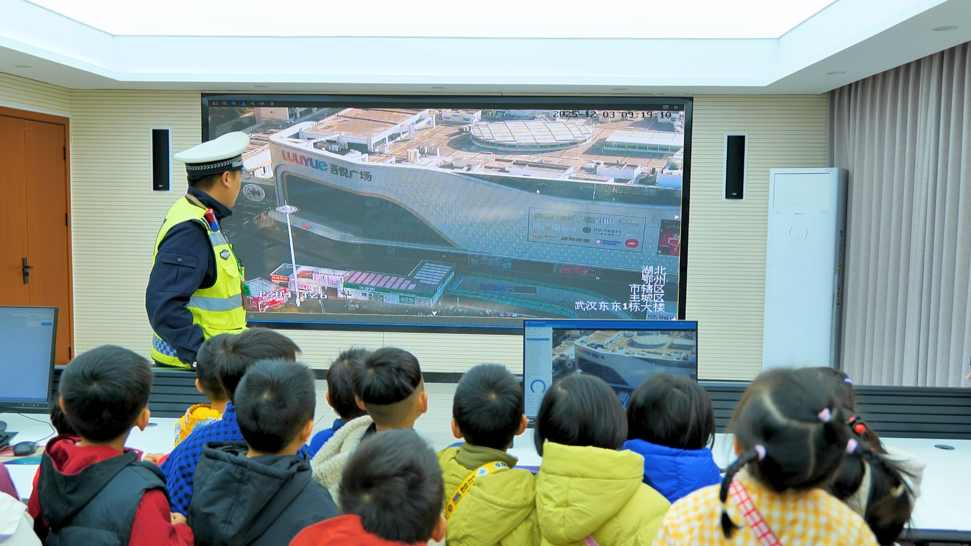 12月3日上午,参观鄂州市公安局交通管理局鄂城大队一中队的旅程正式开启,孩子们的眼睛里瞬间闪烁着好奇的光芒!刚抵达大队,孩子们的目光就被警车吸引,围着警车好奇地观察外观、触摸车身,交警叔叔耐心讲解警车的功能与装备,让孩子们对这个“交通安全守护者”有了初步认知。走进视频指挥中心,左警官的讲解让孩子们大开眼界,他们不仅了解到视频监控中心是城市交通的“智慧大脑”,能实时监控路况、处理突发情况,还亲手操作电脑移动摄像头,清晰看到路口的交通状况。当屏幕上播放交通事故案例时,孩子们都屏住了呼吸,左警官借此着重强调乘车安全要点,让孩子们深刻意识到违反交通规则的严重后果。随后的寝室参观更是让孩子们大开眼界,交警叔叔麻利地将被子叠成方方正正的“豆腐块”,孩子们忍不住拍手叫好,还学着警官的样子比画起来。在警用设备讲解环节,手铐、警棍、强光灯、指挥棒、对讲机等装备一一亮相,交警叔叔拆解每个设备的用途,比如伸缩警棍如何防身、对讲机怎样实现实时沟通,孩子们还亲手拿起装备体验,小心翼翼的动作里满是对交警工作的敬畏。活动最后,孩子们与交警叔叔、阿姨合影留念,一张张笑脸定格了这次难忘的参观之旅。实地的参观体验,让孩子们走出课堂,近距离触摸交警工作的日常,交通安全的种子也在心中悄然扎根。
