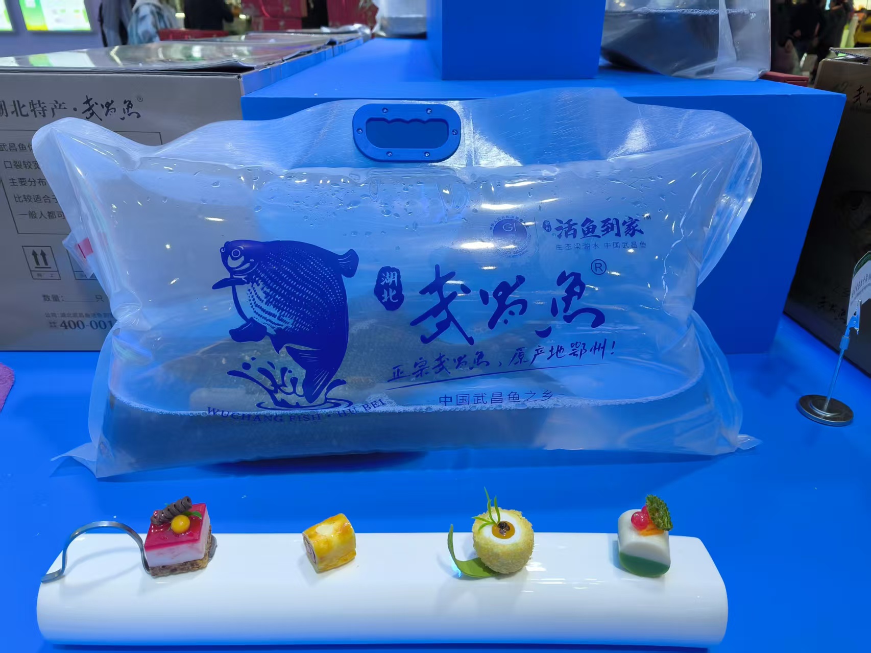 武昌鱼展馆内,展架上的透明空气袋中,武昌鱼悠然摆尾。“清蒸鲜甜,红烧醇厚。”导购员的推介声与上千元售价背后的市场热度,共同指向其核心竞争力——袋中注氧,72小时极致锁鲜。“我们每年直供全国2000家中高端餐厅300万斤活鱼,只为让地道活鲜直达餐桌。”湖北武昌鱼活鱼到家董事长孟辉说。