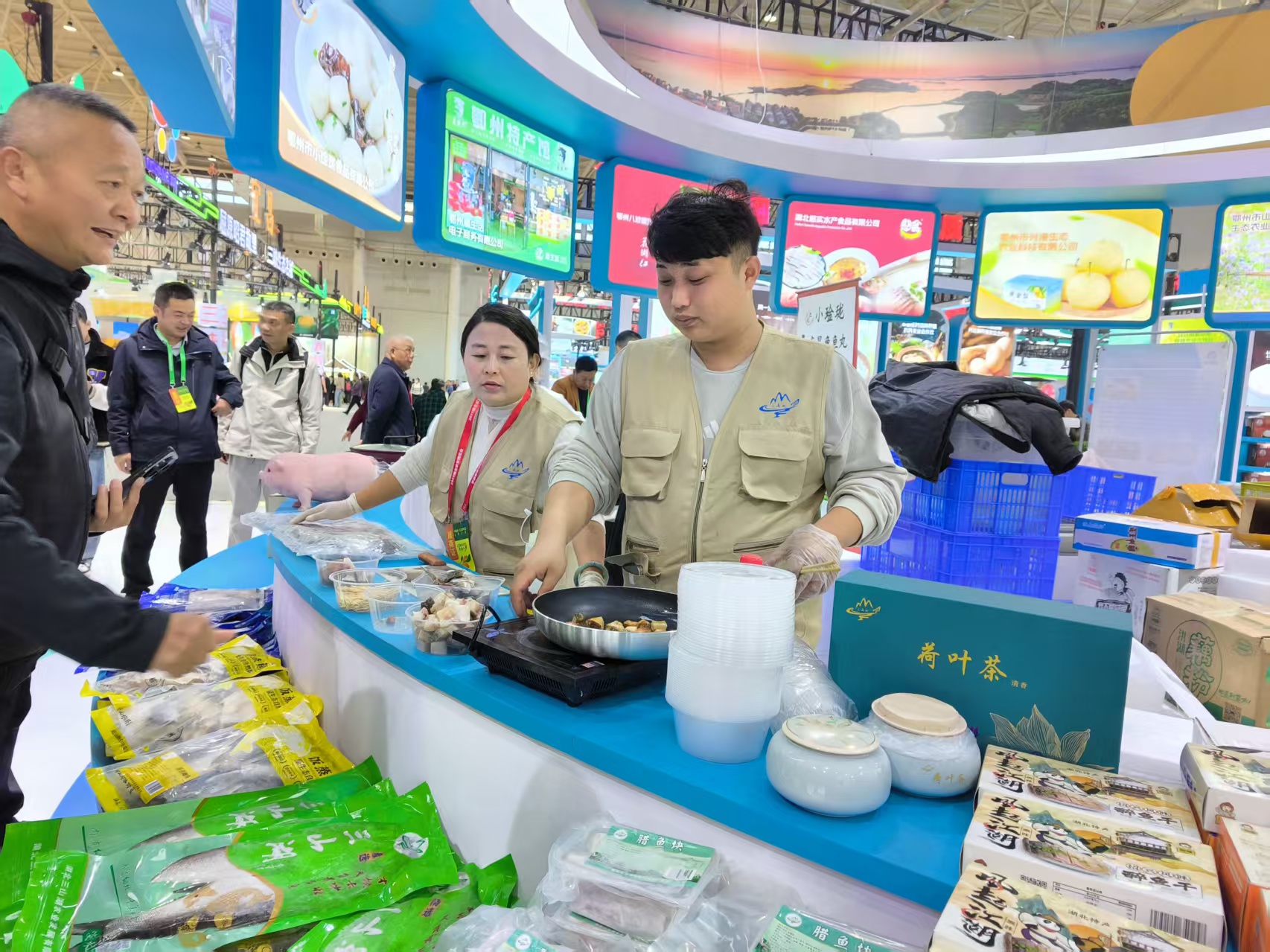 移步鄂州展馆,各家参展商卖力吆喝,积极推介武昌鱼、蓝莓、胡柚等特色农产品,交换名片、洽谈沟通、联系合作,忙得不亦乐乎。这边,鄂州市好口味农业专业合作社负责人周扬现场煎制的沙窝豆丝锅气蒸腾,传统手艺两小时内售罄;那边,借道花湖机场国际航线而来的越南榴莲、埃塞咖啡豆香气交织,宣告全球生鲜正成为鄂州“新特产”。从梁子湖螃蟹到非遗鱼丸,35家企业、90余种产品在此集结,传统特产与全球优品同台,生动诠释着从“本地风味”到“全球餐桌”的开放格局。