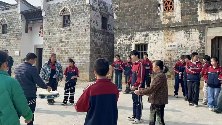接着,广场上,“同心鼓”游戏把气氛推向高潮。起初球总是不听使唤地弹开,同学们和村民们不断调试,更换计划,终于在整齐的节奏声中:“一、二、拉——!”二十根绳子终于同步发力,皮球稳稳弹起十余次。“这就是团队!”同学们欢呼雀跃,村民王奶奶说:“这就是祖国的未来啊!”