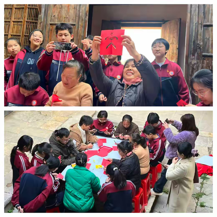 大巴车驶入武城村,白墙黛瓦间跃动的红色剪纸映入眼帘。非遗传承人陈奶奶手持剪刀,手指翻飞,寥寥数剪,一幅生动的“飞燕迎春”瞬间在她手中绽放。同学们围坐一旁,目光紧随红纸的每一次转折。在陈奶奶的鼓励下,几名同学也尝试执剪,尽管动作生涩、线条稚拙,却格外认真。“剪纸不只是手艺,更是咱们老百姓对日子红火、家国安宁的祝愿。”陈奶奶一边指导,一边讲述纹样背后的吉祥寓意。同学们传看着彼此的作品,在亲手触摸与问答交流中,传统不再遥远,文化变得可亲可感,一张薄薄红纸,连起了代代相传的温情与智慧。