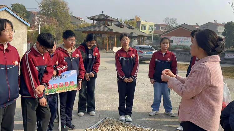 葛店中学生物老师熊小芬老师捡起地头晒着太阳的花生分发给同学们,同学们小心翼翼地传递着,触摸那些沾着故乡泥土的果实。有人轻轻掰开一个荚果,新鲜花生仁的清甜气味悄悄弥漫开来——那是雨水的味道、根系的味道。熊老师从生物学角度讲解了花生果实的构造后,说道:“生物学告诉我们结构,”她转过身,手里握着一把花生,“但生活教会我们意义。记住今天触摸过的这些凹凸不平的荚果——它们选择在泥土中成熟,是因为扎实根基才能结出果实。”
