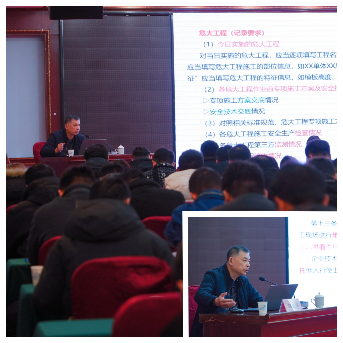 本次培训为期三天,以“精准赋能、务实提效”为核心,构建“政策解读+案例剖析+实操指导”三位一体授课体系,邀请省市住建领域资深专家和业务骨干集中授课。在质量安全板块,重点解读了《住宅工程质量常见问题防治手册》和建筑施工承插型盘扣式钢管脚手架常见隐患及现场管理要点等内容。授课专家结合典型事故案例,深入剖析危大工程管控、高处坠落防治等重点环节的风险点与防范措施,强化参建各方主体责任意识;标准定额环节聚焦工程计价新规、绿色施工定额应用及工程款支付担保实操要求,通过政策拆解与案例演算,帮助参训人员精准掌握定额套用、造价核算等关键技能,助力规范建筑市场秩序。城建档案模块则围绕《城市建设档案管理规定》及电子档案归档新标准,详细讲解档案收集、整理、移交全流程规范,重点解读声像档案拍摄要求、数字化归档技术及“验收+承诺”制移交流程,推动档案管理从“合规化”向“精细化”转变 。培训还专门就建筑市场 “三包一挂” 等突出违法违规行为进行警示告诫,清晰划定行为红线;并对工程领域关键岗位人员提出刚性要求,督促其严格落实到岗履职责任。同时还要求建筑领域各工程项目加强食堂食品安全管理,严防食物中毒事件;密切关注疫情和季节性流感防控,持续做好人员健康监测和环境卫生消杀,确保施工一线防疫安全。