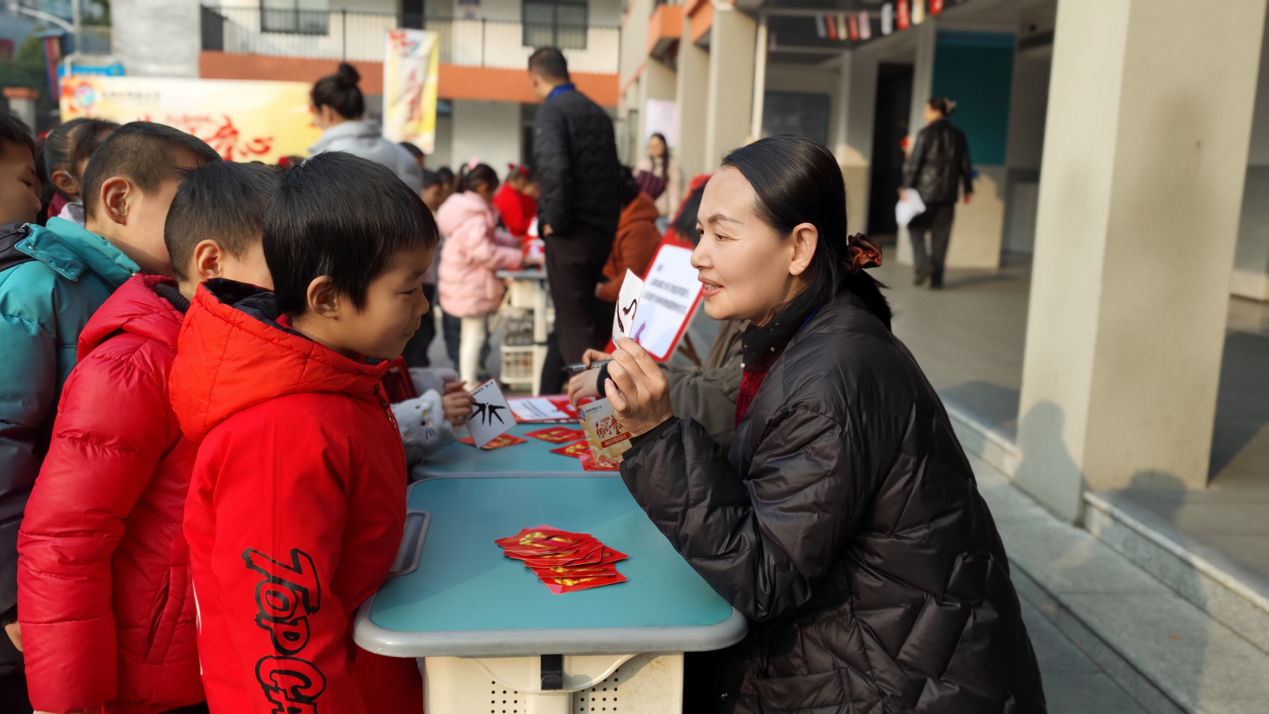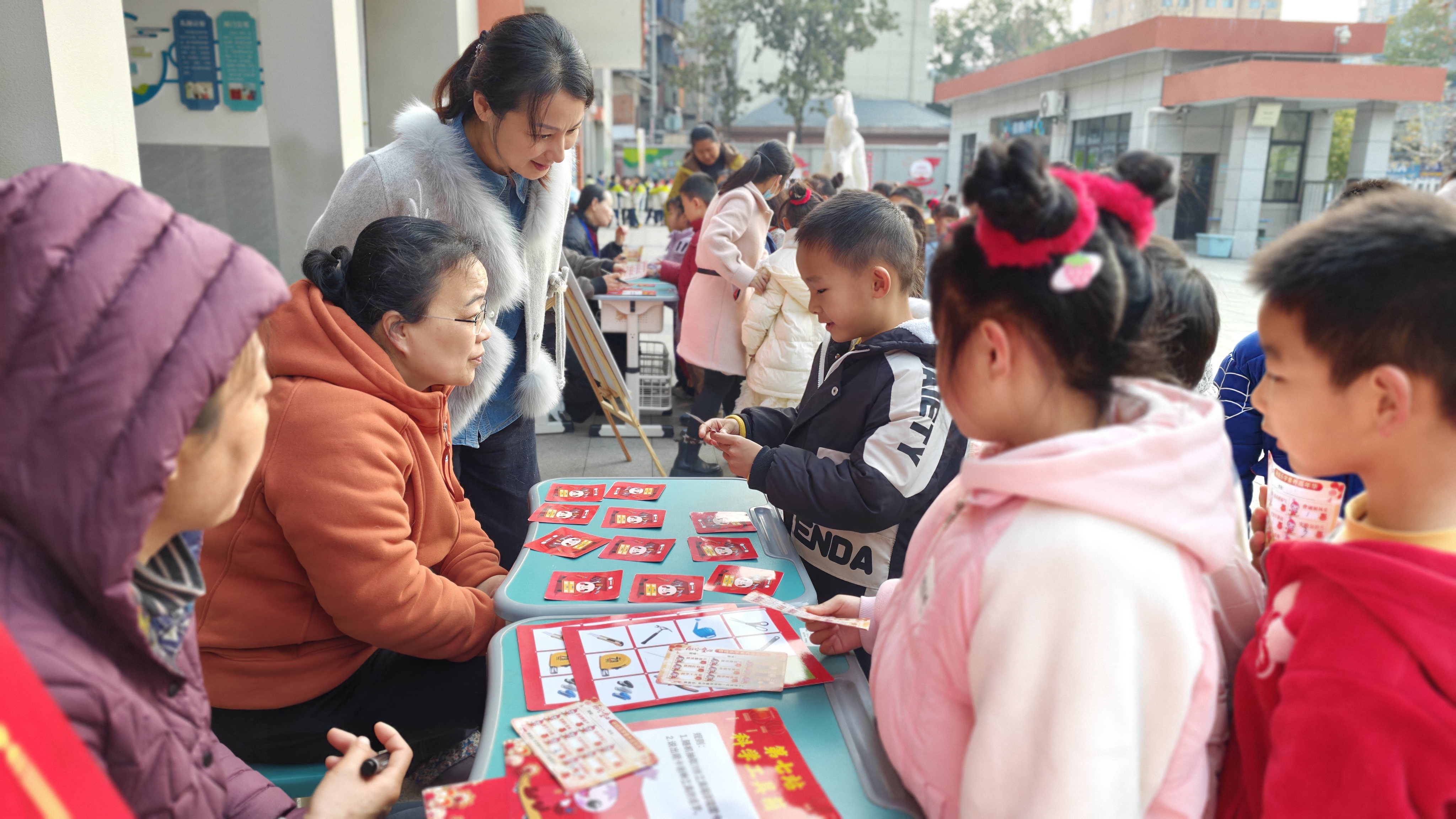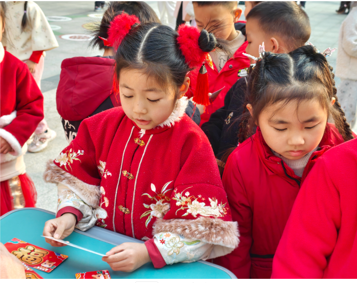 走进“荷香致远 趣学语文”闯关区,年味十足的题卡格外吸睛。糖葫芦、福袋、红包造型的卡片里,藏着拼音拼读、古诗背诵、情境表达等趣味任务。孩子们或声情并茂地吟诵经典,或看着情境图大胆讲述,在传统文化的浸润中,尽显语言运用能力与文化审美素养。