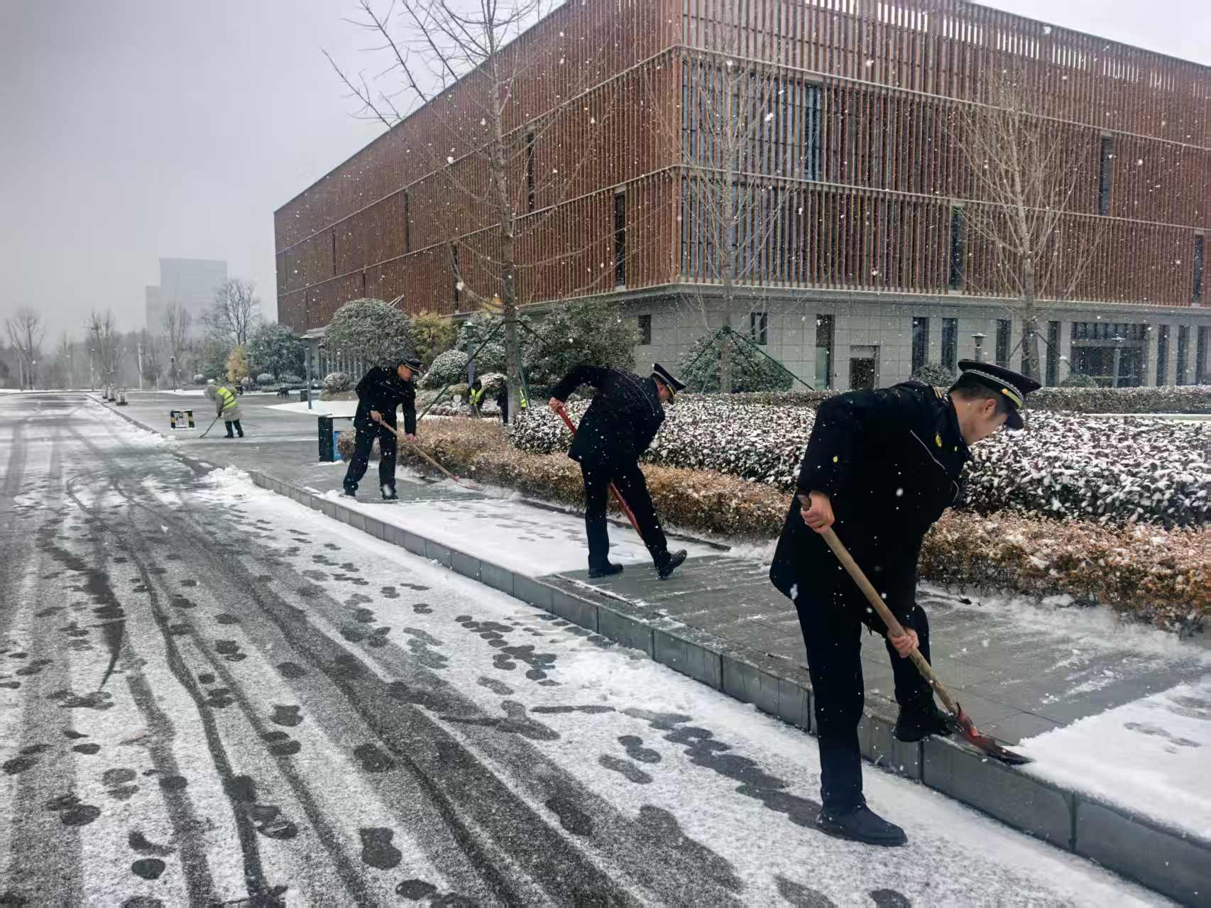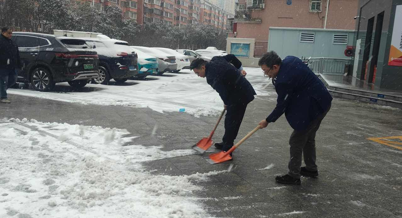 清晨雪暂歇,网点门前已覆上一层积雪。分行立即启动应急预案,由主要负责人带头,员工们手持铁锹、扫帚,对入口通道及周边人行道路展开全面清理。寒风之中,大家配合默契、干劲十足,历时一个多小时开辟出数条安全通道,并及时铺设防滑垫、设立提示牌,于细微处守护每一位客户的出行安全。