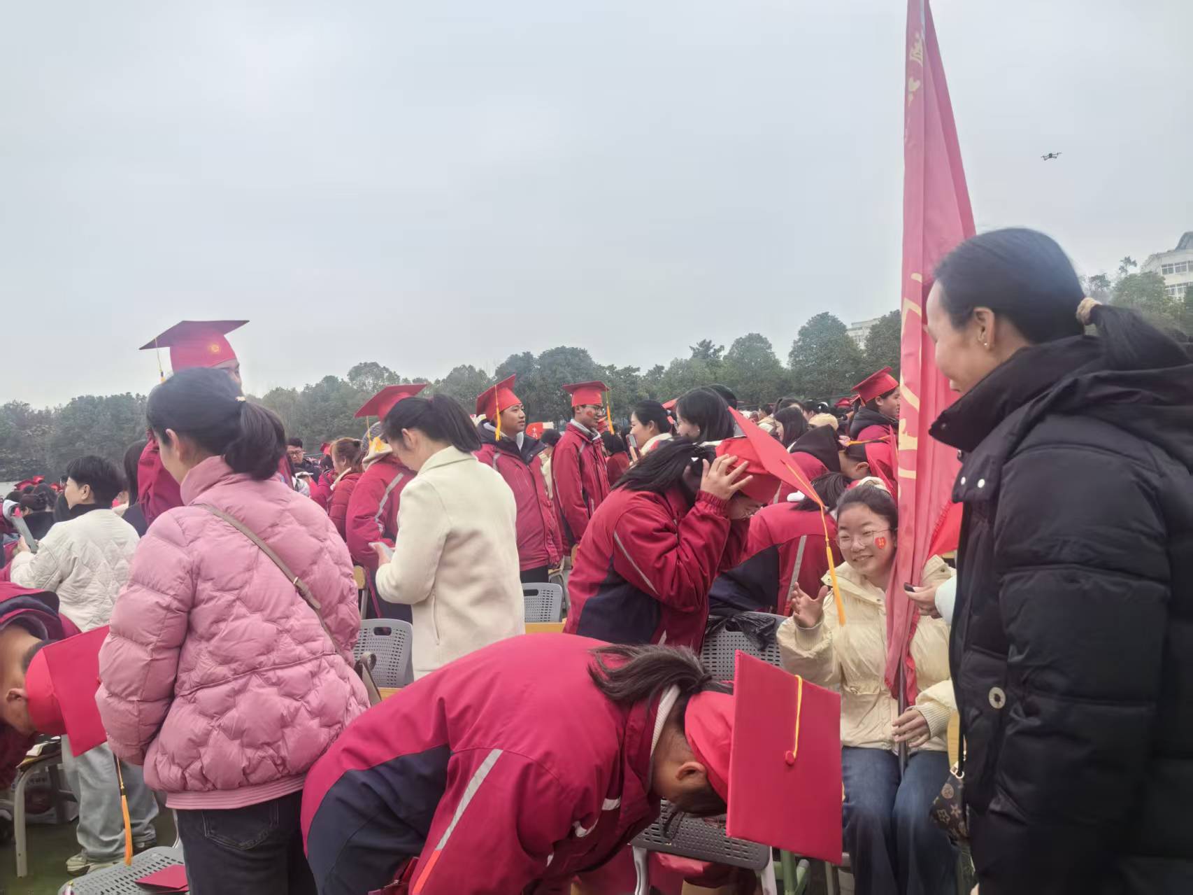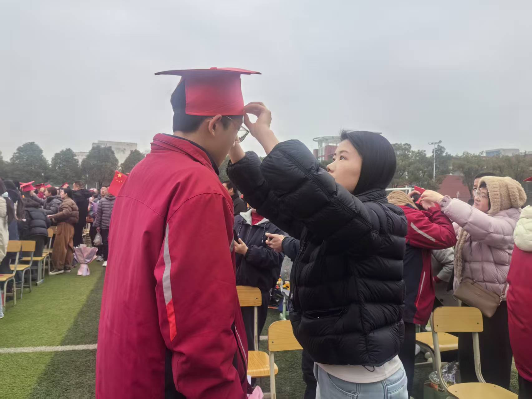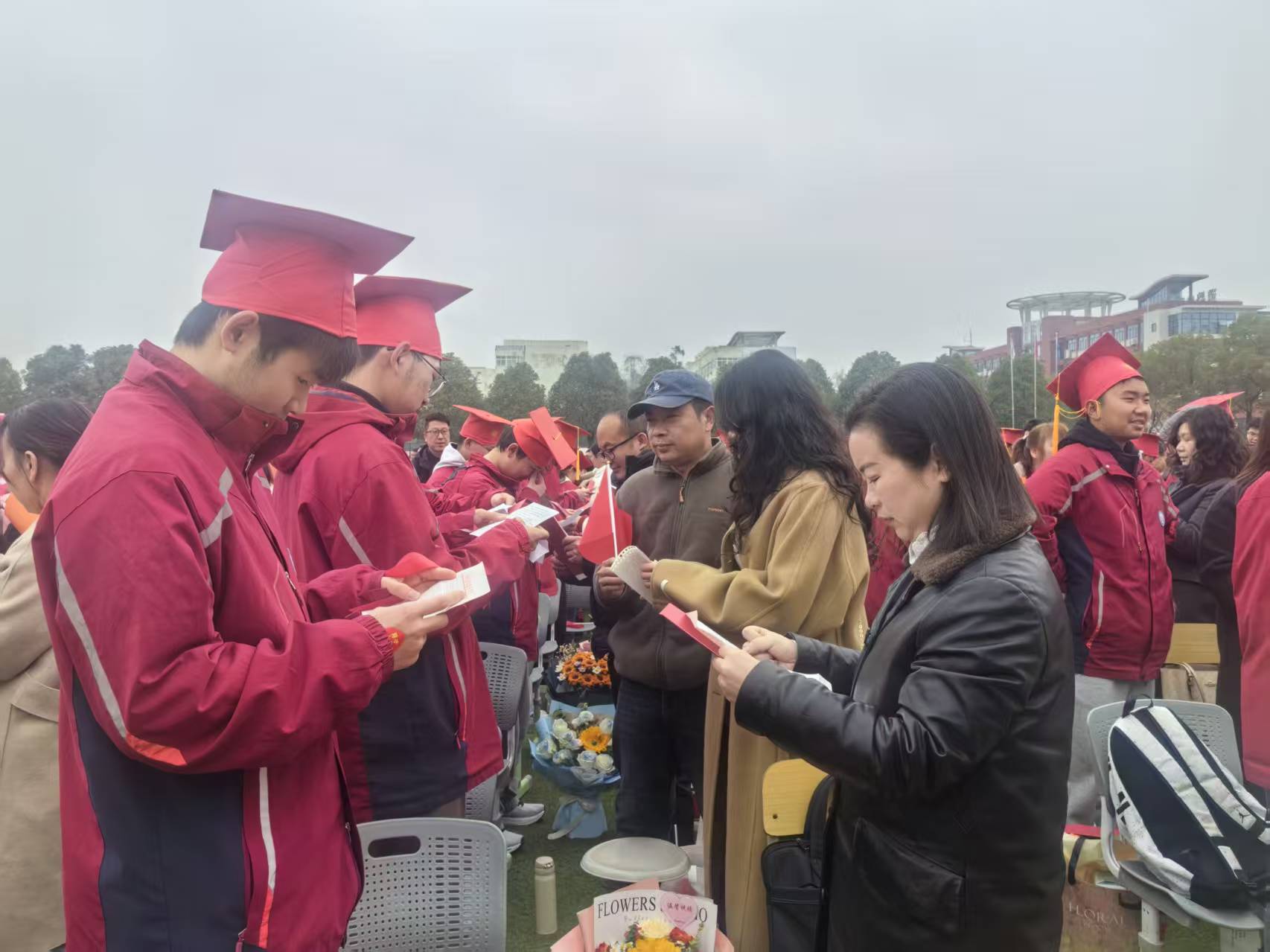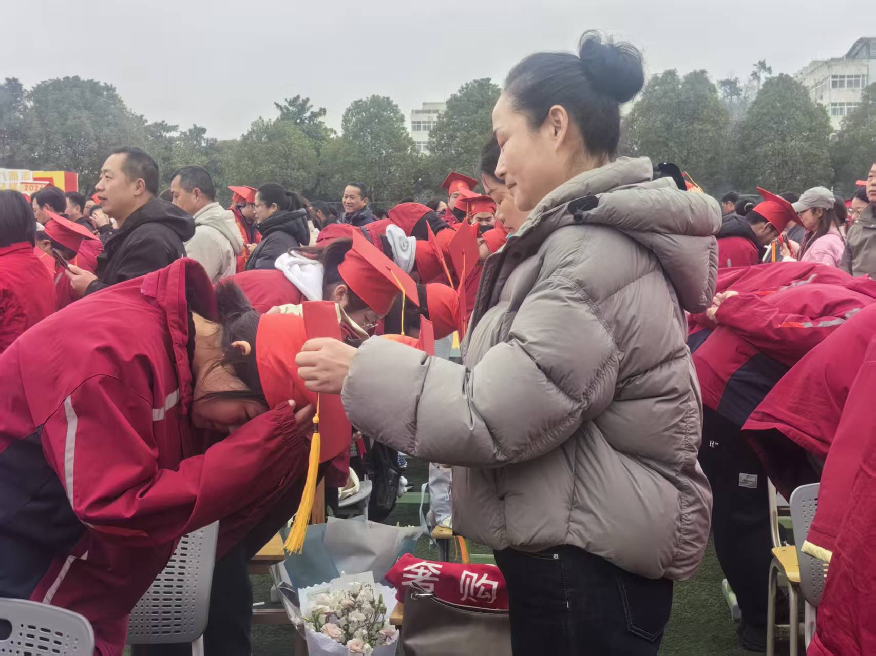 在悠扬的感恩旋律中,“冠礼”仪式温情上演。家长们郑重地为孩子戴上成人礼帽,轻轻整理帽檐,眼中闪烁着欣慰与不舍的泪光。学生向父母行拜谢礼,深深鞠躬,递上满载心意的家书。静默的三分钟里,信纸上的字迹被泪水晕开,一个个深情的拥抱,将千言万语化作无声的温暖。随后,学生代表手捧鲜花走向班主任、任课老师,向朝夕相伴的恩师鞠躬致谢。