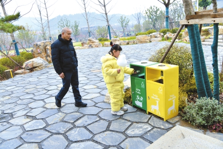 家长引导孩子将垃圾投入垃圾桶。