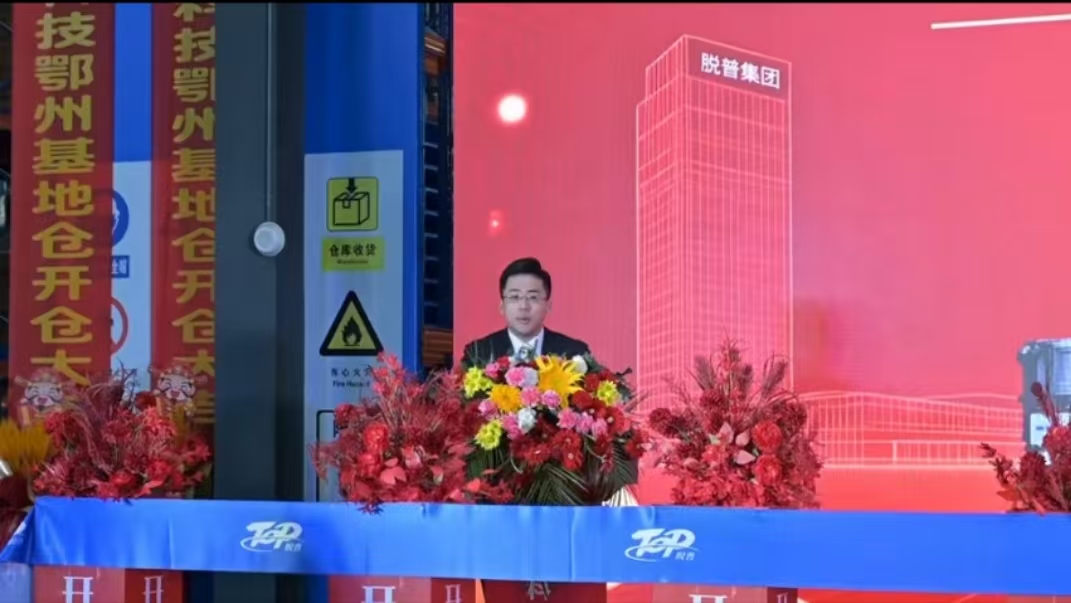 ▲脱普供应链鄂州基地仓开仓仪式上,脱普集团副总裁洪伟伦致辞