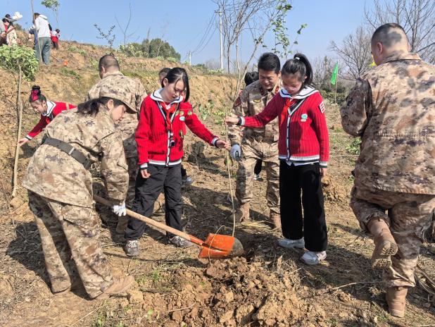 活动现场春意盎然,处处洋溢着欢乐与活力。在老师和志愿者的指导下,同学们热情高涨、分工明确、配合默契。大家纷纷拿起铁锹、扛起水桶,认真地完成挖坑、扶苗、填土、踩实、浇水等每一个环节,动作虽略显稚嫩,却一丝不苟、井然有序。阳光下,一张张朝气蓬勃的笑脸,一个个忙碌的小小身影,成为春日里最动人的风景。经过共同努力,一棵棵充满生机的小树苗迎风挺立,为美丽的长江沿岸增添了一片崭新的绿意。