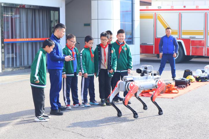 活动伊始,师生们有序进入消防救援大队,消防员致欢迎辞,并向大家详细介绍了本次参观流程与安全注意事项。随后,大家近距离观摩了消防车辆与各类救援装备,消防员详细讲解了消防救援机器狗、无人机、红外热成像技术、救援云梯等设备的功能用途,以及破拆工具、空气呼吸器、隔热服等器材的使用方法等,激起了孩子们的好奇心。