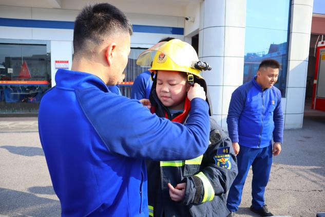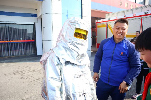 消防员还讲解了在不同救援情况下的救援服装和相应救援工具的使用,以及生活中常见的消防工具。接着试穿消防服,沉重的消防服压得孩子们喘不过气,让他们深切体会到,消防员叔叔身上那份沉甸甸的责任与担当真的不容易。