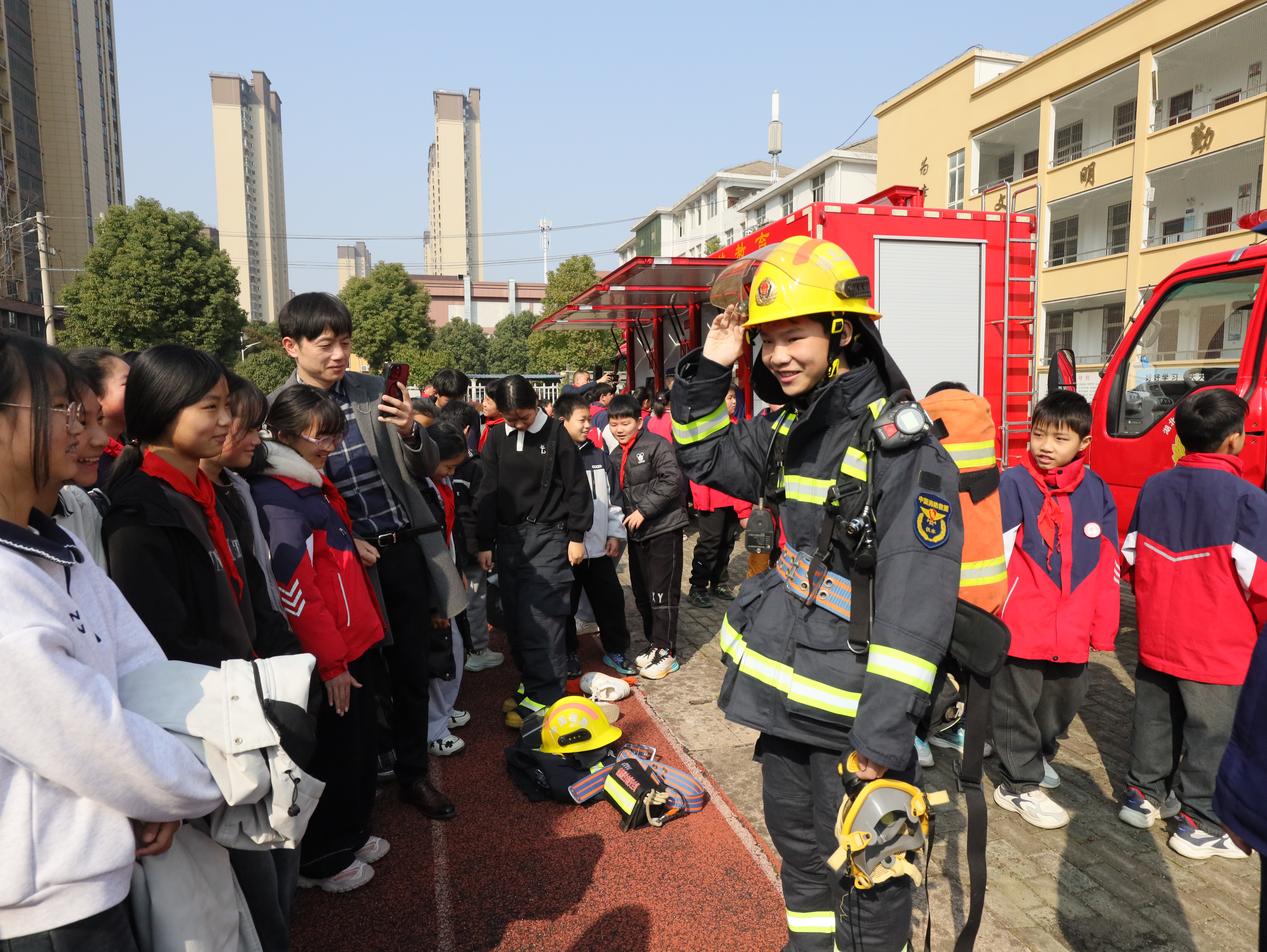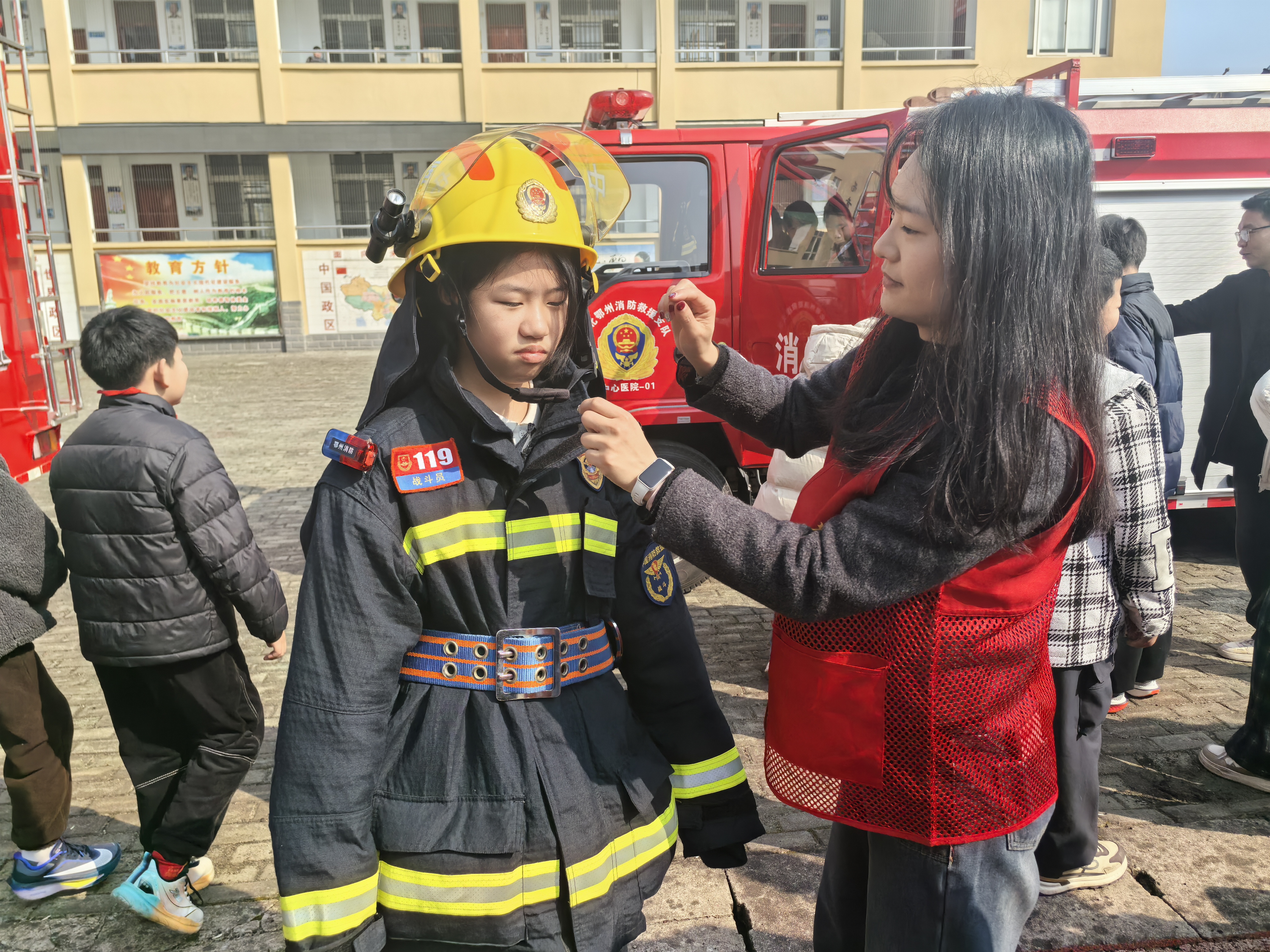 在装备参观与体验环节,“蓝朋友”们向师生们展示了消防车辆及专业器材,学生们在指导下试穿了灭火防护服,亲身体验了消防装备。鄂城区消防救援大队相关人员指出,推动消防安全教育以生动形式走进校园,旨在实现“教育一个孩子,带动一个家庭,影响整个社会”的辐射效果,共同筑牢消防安全的人民防线。