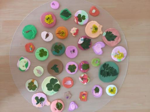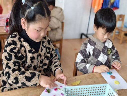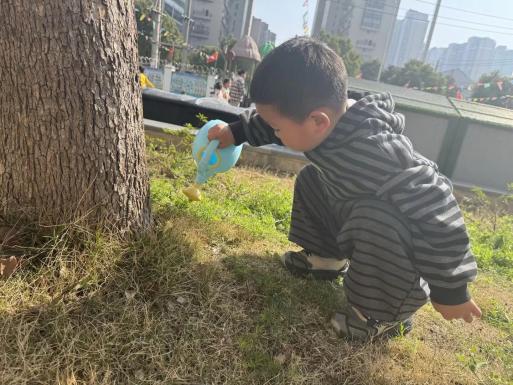 大班的孩子们化身自然收藏家,收集落叶、花瓣、小草等春日礼物。
