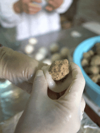 每日天未亮,曹秋娥便开始忙碌,蒸糯米、煮绿豆。豆子煮烂捣泥,加盐调味后搓成丸子。糯米蒸好后,趁热用机器搋成糍粑,揪成小剂子包馅,用工具一压,圆润的油粑便成型。