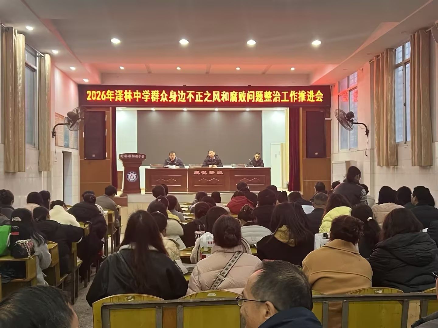 近日,鄂城区泽林中学召开2026年群众身边不正之风和腐败问题整治工作推进会,全体教职工齐聚一堂,以严的基调、实的举措深化作风建设,为校园营造风清气正的育人环境,为学校高质量发展筑牢廉洁根基。
