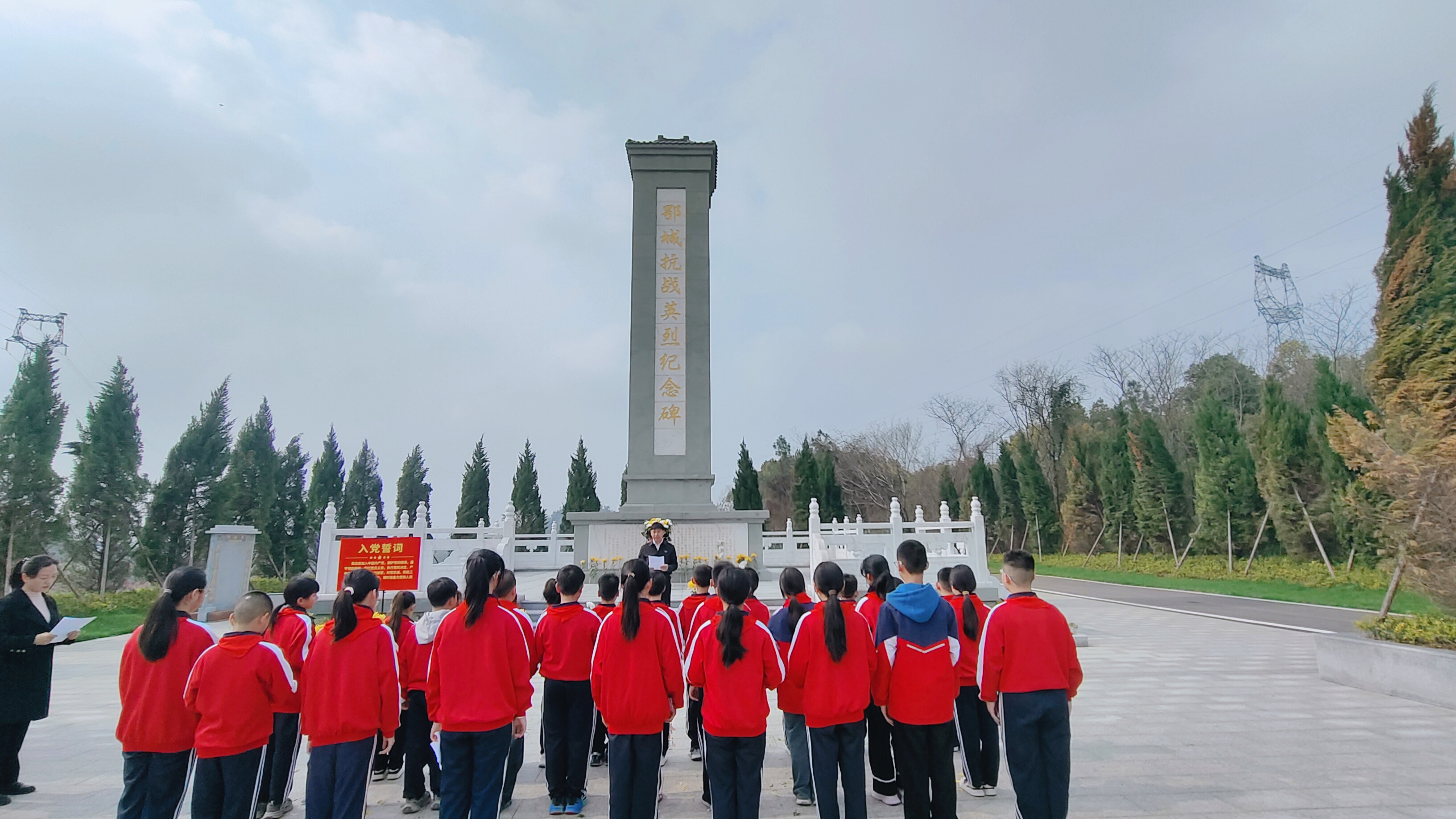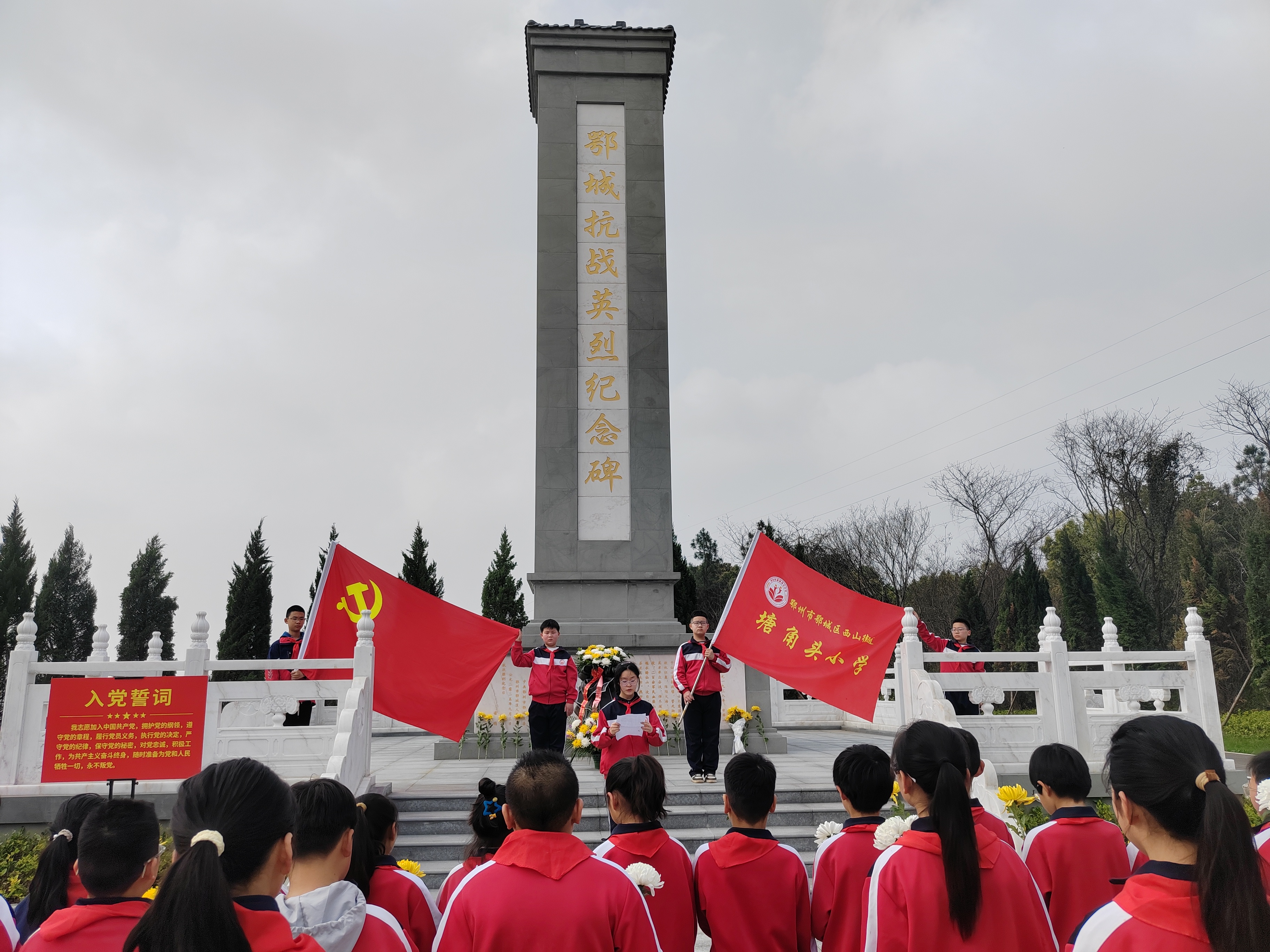 全体师生向革命先烈三鞠躬,感念先烈们为民族独立、人民解放抛头颅、洒热血的英勇壮举。优秀少先队员代表华芷轩上台发出倡议,号召同学们铭记历史、珍惜当下,以先烈为榜样,勤奋学习、立志报国。少先队辅导员带领全体少先队员面向队旗庄严宣誓,重温誓词、齐声呼号,铿锵的誓言回荡在纪念碑前,彰显出新时代少年儿童坚定的理想信念。校长在讲话中回顾了鄂城抗战的峥嵘岁月,勉励全体师生传承红色基因,厚植爱国情怀,将先烈精神融入日常学习与生活中,勇担时代使命。