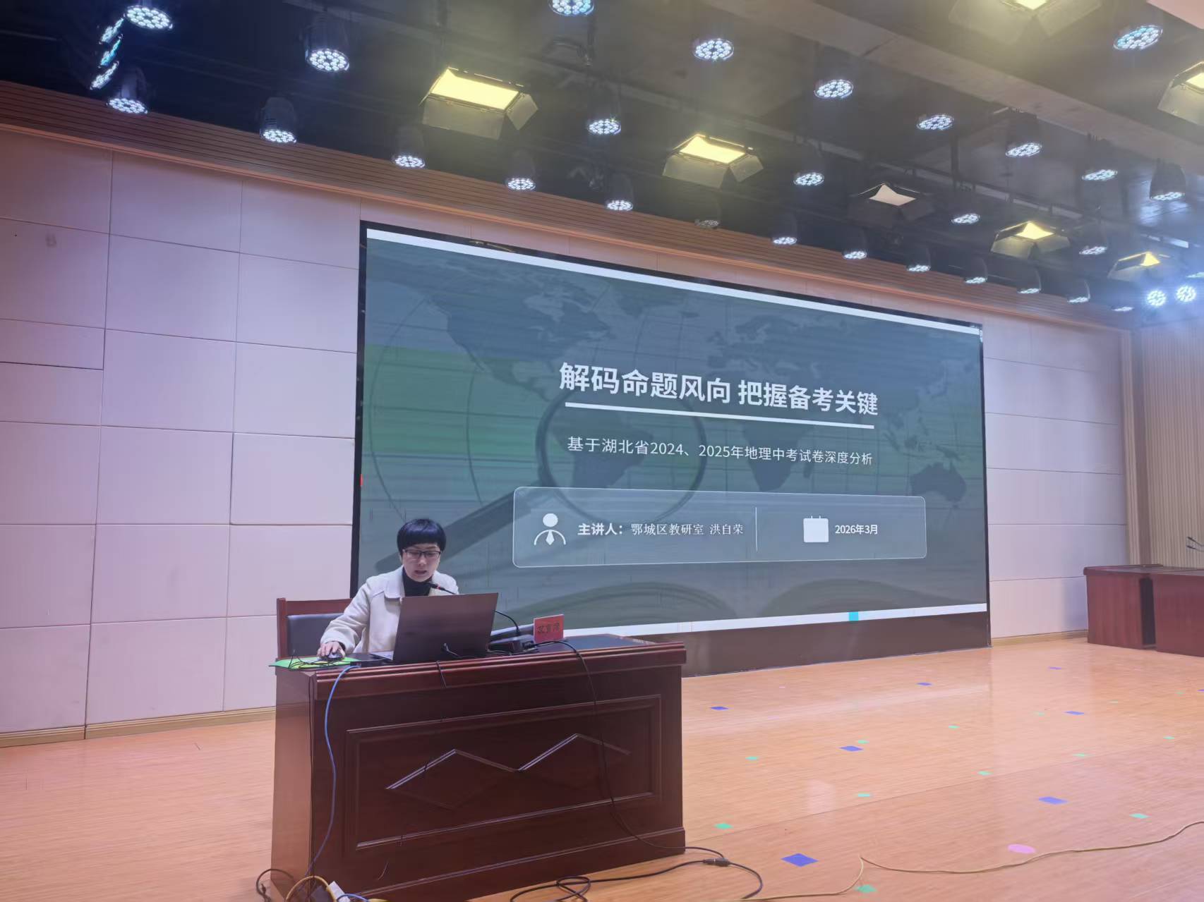 鄂城区教研室地理教研员洪自荣以“解码命题方向,把握备考关键”为主题,对2024-2025年湖北地理中考试卷进行细致分析。他明确,中考地理试卷结构保持稳定,但命题立意持续深化,考查重心从知识记忆转向素养评价,且2025年命题更贴合湖北本土实际,为参会教师梳理出清晰的命题规律与备考重点。