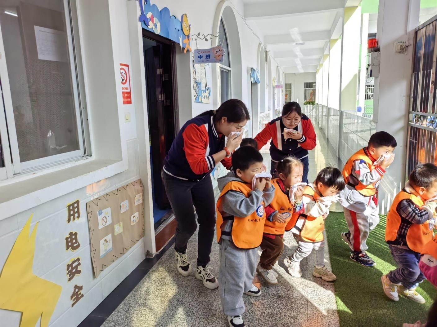当天上午,幼儿园校园内一片宁静,师生们正有序开展日常保教活动。突然,一阵急促的消防警报声划破校园的静谧,演练正式拉开帷幕。听到警报声后,全园师生迅速响应,严格按照预设的消防安全疏散方案,进入应急逃生状态。各班教师第一时间停止教学活动,快速组织幼儿弯腰俯身,双手紧握湿毛巾捂住口鼻,避免吸入“浓烟”,同时轻声安抚幼儿情绪,引导孩子们不推挤、不慌张,沿着既定逃生路线,冷静、有序地向指定安全集合点撤离。