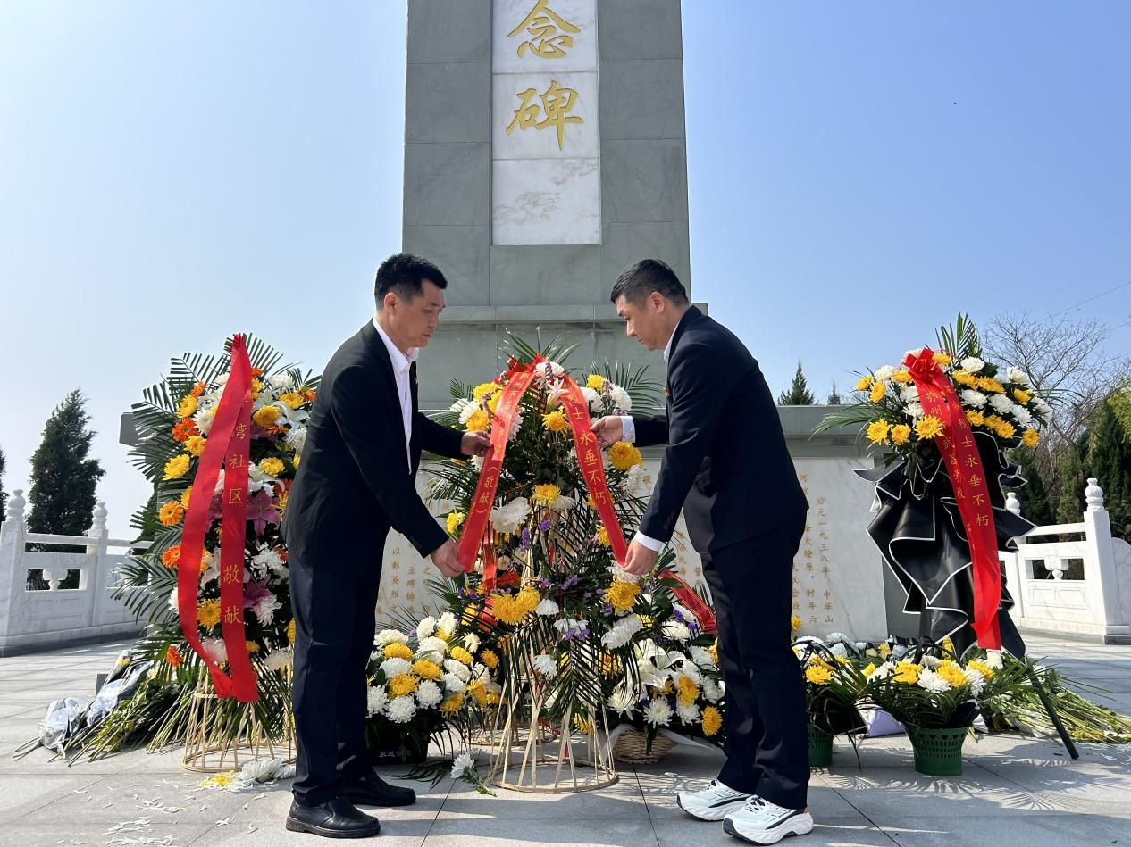 伴随着庄重的氛围,校党总支书记陈敬松、校长严荆缓步上前,代表全校师生向英烈敬献花篮,仔细整理缎带,致以崇高敬意。