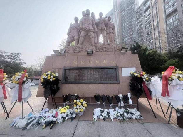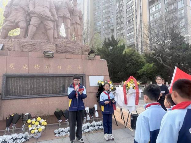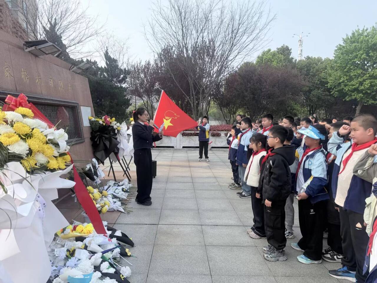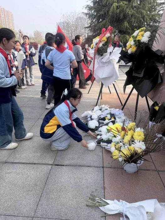 奏唱《中国少年先锋队队歌》后,学生代表缓步上前,向烈士纪念碑敬献花篮,鞠躬致意,寄托哀思。