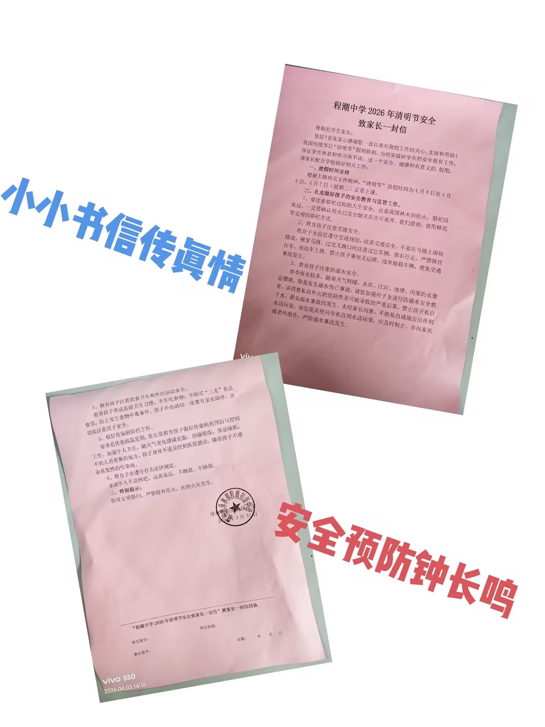 为筑牢家校安全共育防线,学校专门发放《清明节假期安全倡议书》,通过班级微信群、家长群反复推送安全提醒,明确家长在假期中的监护主体责任,呼吁家长全程关注孩子的出行、祭扫及日常活动,配合学校做好安全监管,携手为孩子打造安全的假期环境。