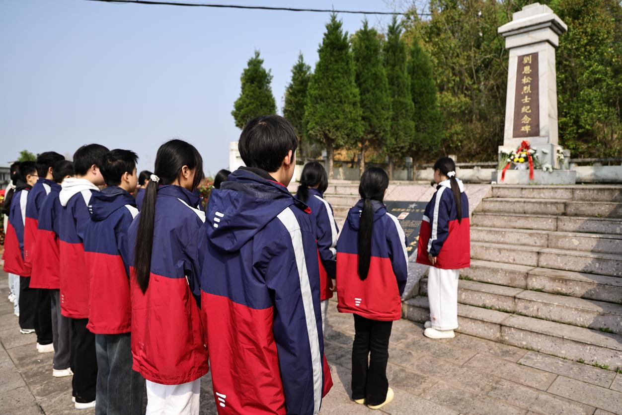 仪式第一项,全体师生整理着装、肃立注目,面向刘恩松烈士纪念碑行三鞠躬礼:一鞠躬致敬英烈、缅怀功绩,二鞠躬铭记历史、传承精神,三鞠躬不忘初心、砥砺前行。每一次鞠躬,都承载着师生们对革命先烈的无限追思与崇高敬意。