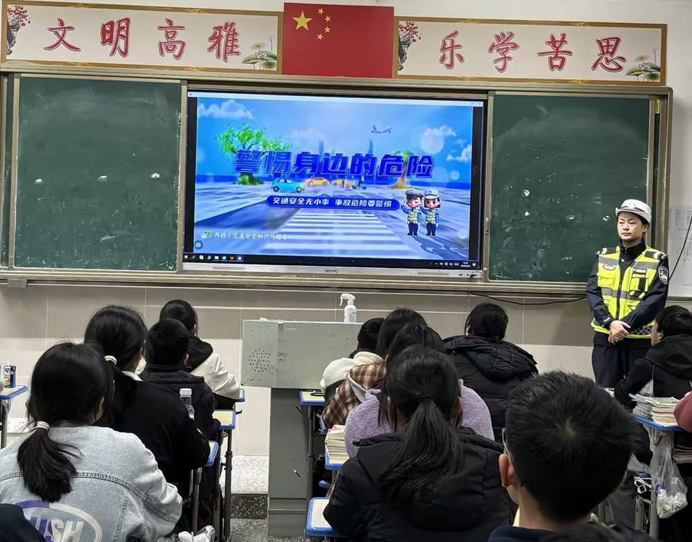 上好一堂交通安全主题课。线上提醒学生及家长收看“知危险 会避险”2026年春季全国中小学生交通安全主题课,共同学习交通安全知识;线下邀请临空交警大队民辅警通过集中宣讲、播放警示教育片、发放宣传资料等形式宣传交通安全知识。