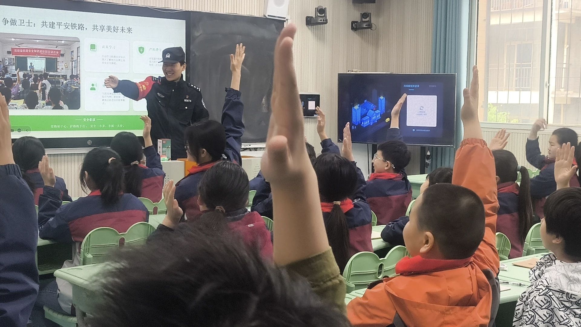 活动现场,铁路民警结合小学生的认知特点,通过PPT演示、案例讲解、互动问答等多种形式,用通俗易懂的语言,向同学们详细讲解了铁路安全的重要性。民警围绕“惊人的速度、漫长的制动、巨大的列车风”三个核心要点,直观展示了高铁运行的安全风险,让同学们深刻认识到在铁路沿线玩耍、攀爬铁路设施、横穿轨道等行为的严重危害。同时,民警还详细普及了铁路安全法律法规,引导同学们自觉遵守铁路安全规定,不做危害铁路安全的行为,争做铁路安全的小小宣传员,把安全知识带回家,带动家人共同守护铁路安全。