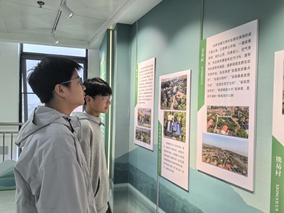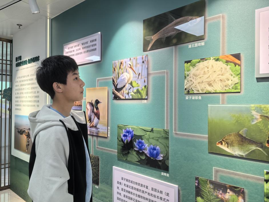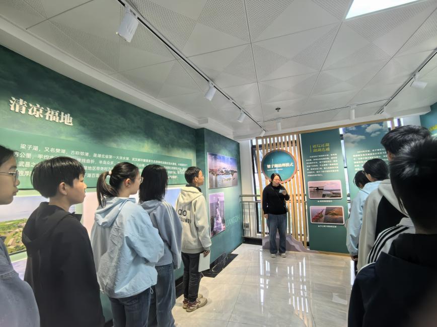 在大美梁子湖展厅,一幅幅展现梁子湖自然风光的精美图片、一段段介绍生态保护历程的文字资料,生动呈现了梁子湖的生态之美。同学们驻足观看,认真了解梁子湖的地理风貌、湿地资源与生态保护成果,真切感受到家乡绿水青山的珍贵,进一步树立了尊重自然、保护生态的环保意识,纷纷表示要争做生态保护的践行者,守护家乡的一湖清水。