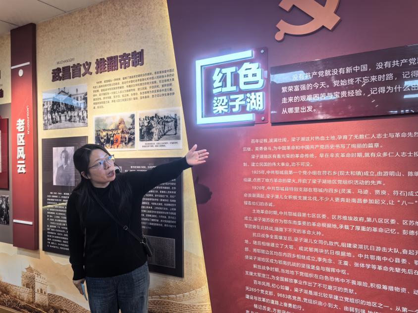 最让同学们深受触动的是红色梁子湖展厅。展厅内,珍贵的革命文物、泛黄的历史照片、感人的英雄事迹,再现了梁子湖地区波澜壮阔的革命岁月。讲解员深情讲述着革命先辈们在这片土地上浴血奋战、不畏牺牲的红色故事,展现了先辈们坚定的理想信念与无私的爱国情怀。同学们凝神聆听,神情庄重,深刻感悟到今天幸福生活的来之不易,心中的爱国情怀与奋斗信念被深深点燃。