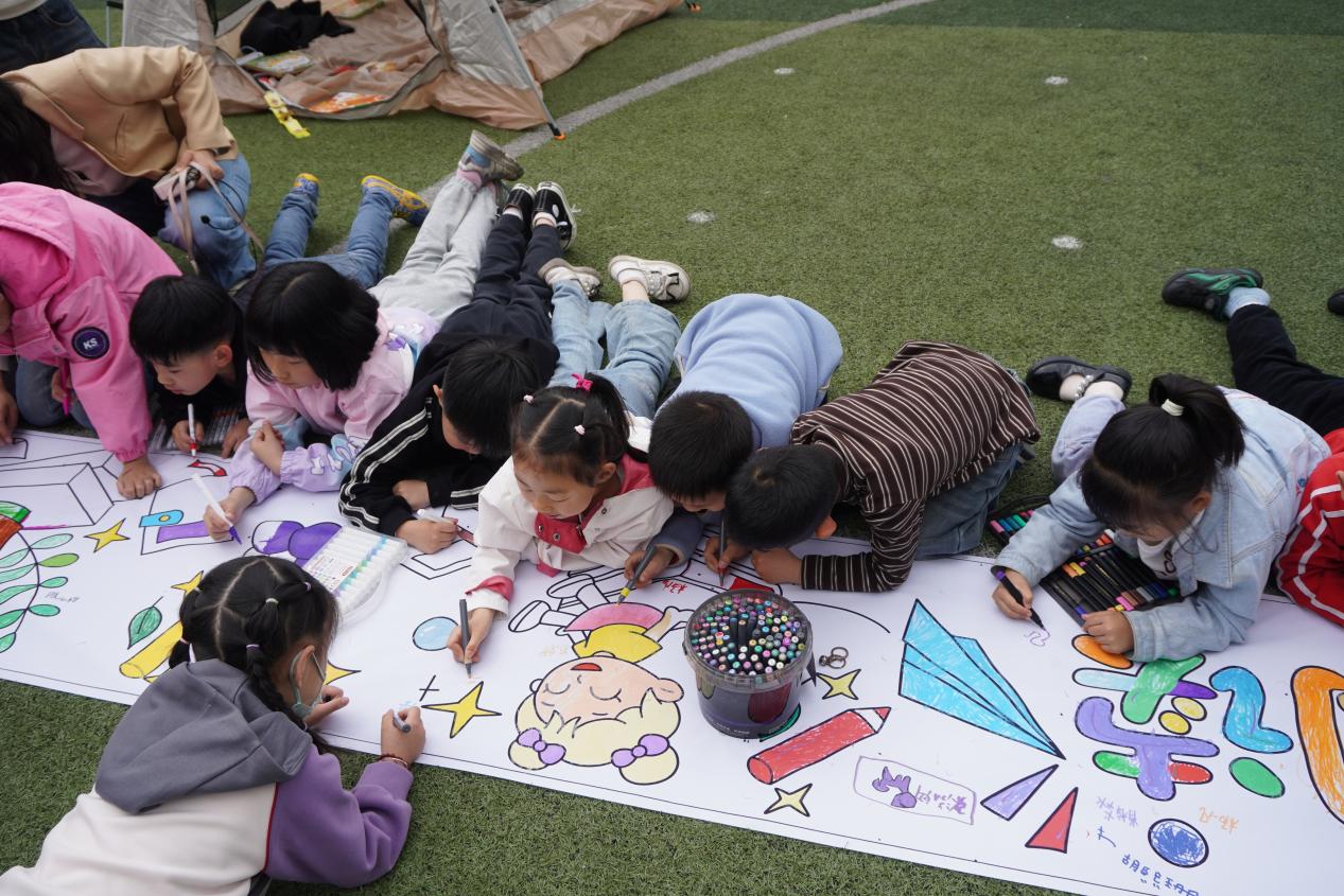 随后,帐篷亲子共读温情展开。家长领读员带领孩子围坐在帐篷中,或轮流领读,或安静品读,或热烈分享,笑声与书香交织。阅读之后,孩子们趴在十米长卷上涂鸦班级读书宣言,齐心协力完成色彩缤纷的海报,并集体打卡合影。